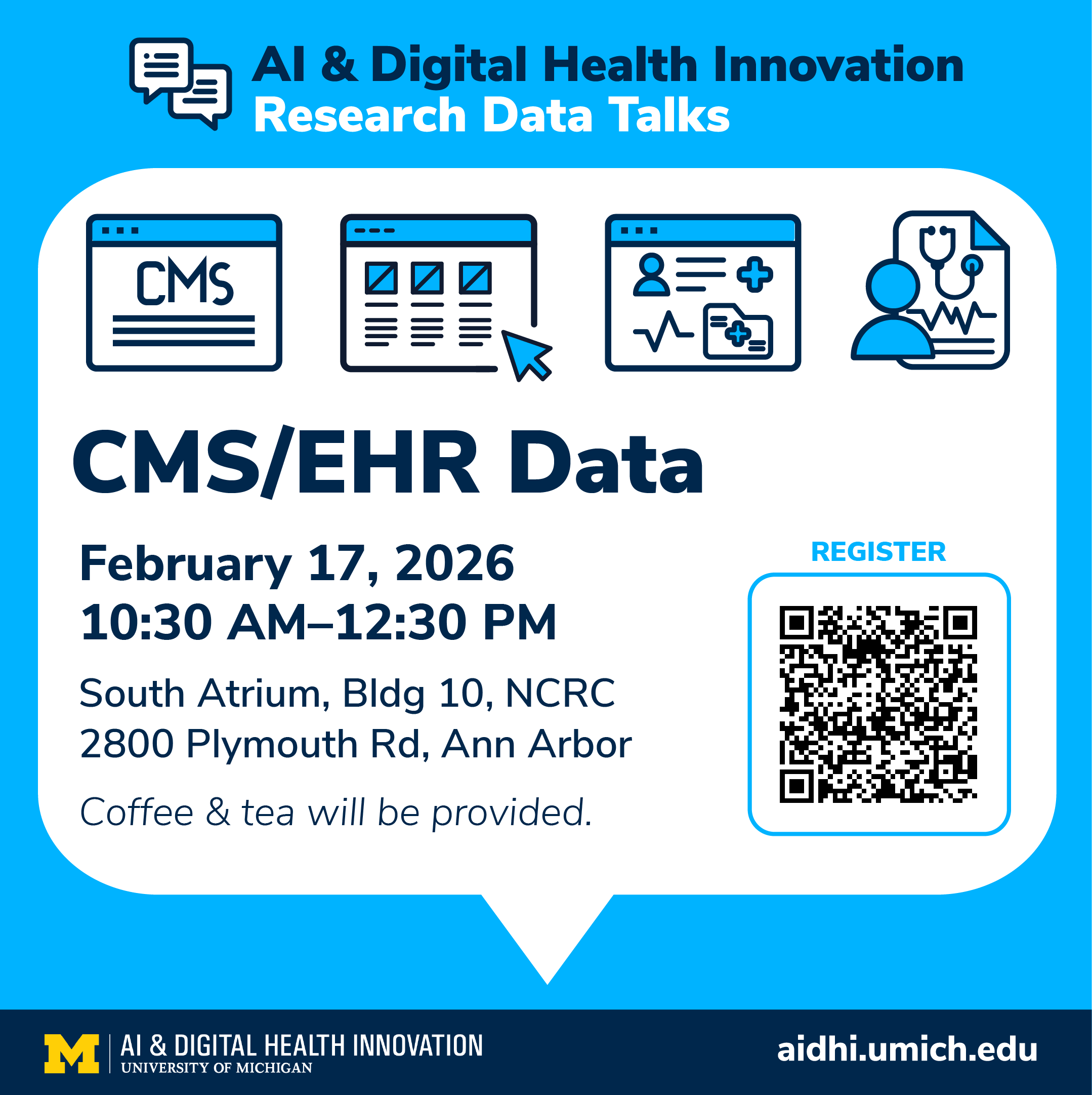 Our second session, "CMS/EHR Data," focuses on our CMS claims/Michigan Medicine electronic health record (EHR) Data Repository and will highlight the work of multiple AI&DHI community members who are using this resource to inform and enable their health research.